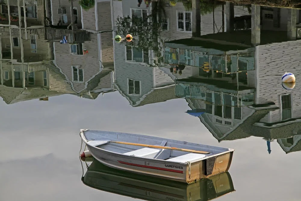 Shiny surfaces like water, windows, metal, etc. are particularly good for them. The two below use water to produce some interesting reflections. The first photo is a little disorienting. The reflection in the super still water fools the eye. The only things on top of the water are the boat and 3 buoys. The rest is a reflection of all the houses. For reference, I left a small triangle of actual ground in the upper right of the image.