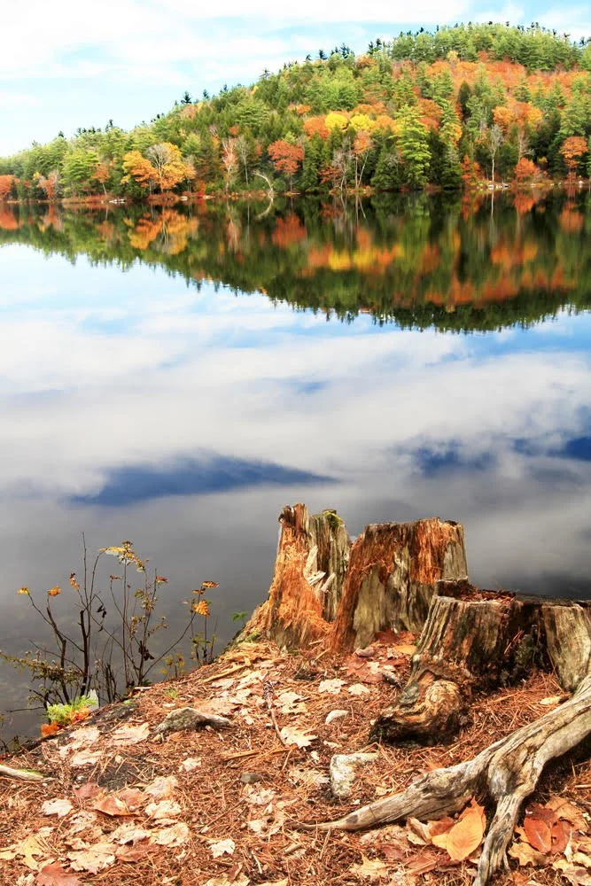 The second photo shows both the reflection of the facing hill and the sky above the hill. The two together make it look like the hill is “floating” in the sky. The tree stump in the foreground establishes a reference point.